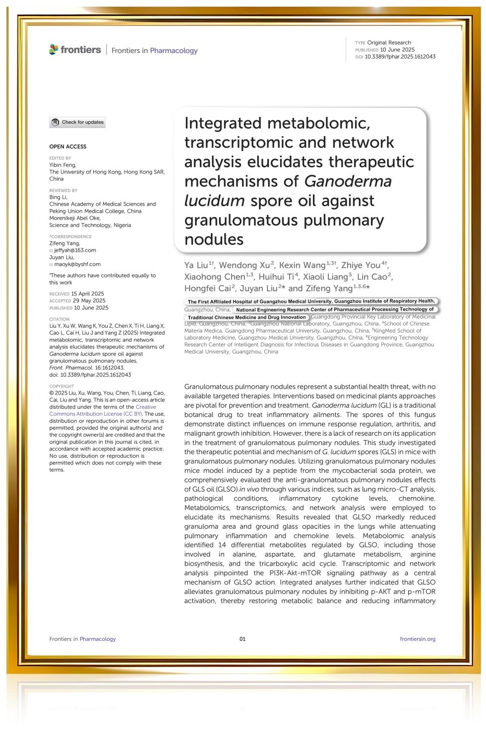 近期融胜配资,白云山汉方联合权威呼吸研究机构合作对广药牌灵芝孢子油产品开展了《灵芝孢子油防治肺结节的功效探索及机制研究》,相关研究成果在国际知名的SCI期刊《Frontiers in Pharmacology》(药理学前沿)发表。