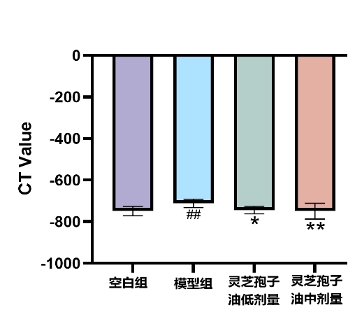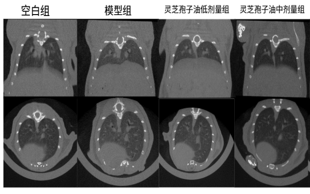 图:灵芝孢子油对肉芽肿型肺结节小鼠肺部断层扫描检测结果及统计